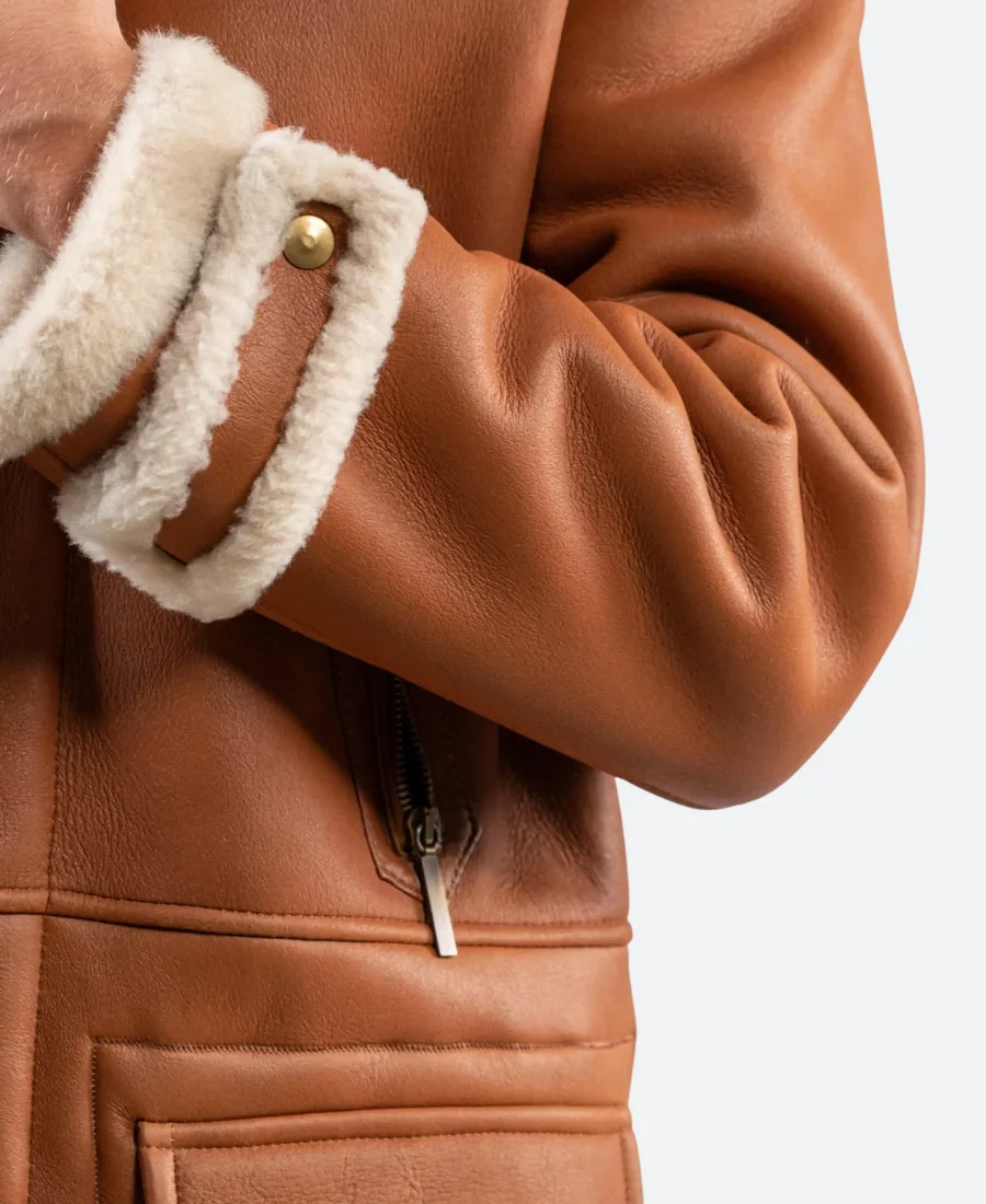 Classic Tan Leather Hooded Shearling Trench Coat